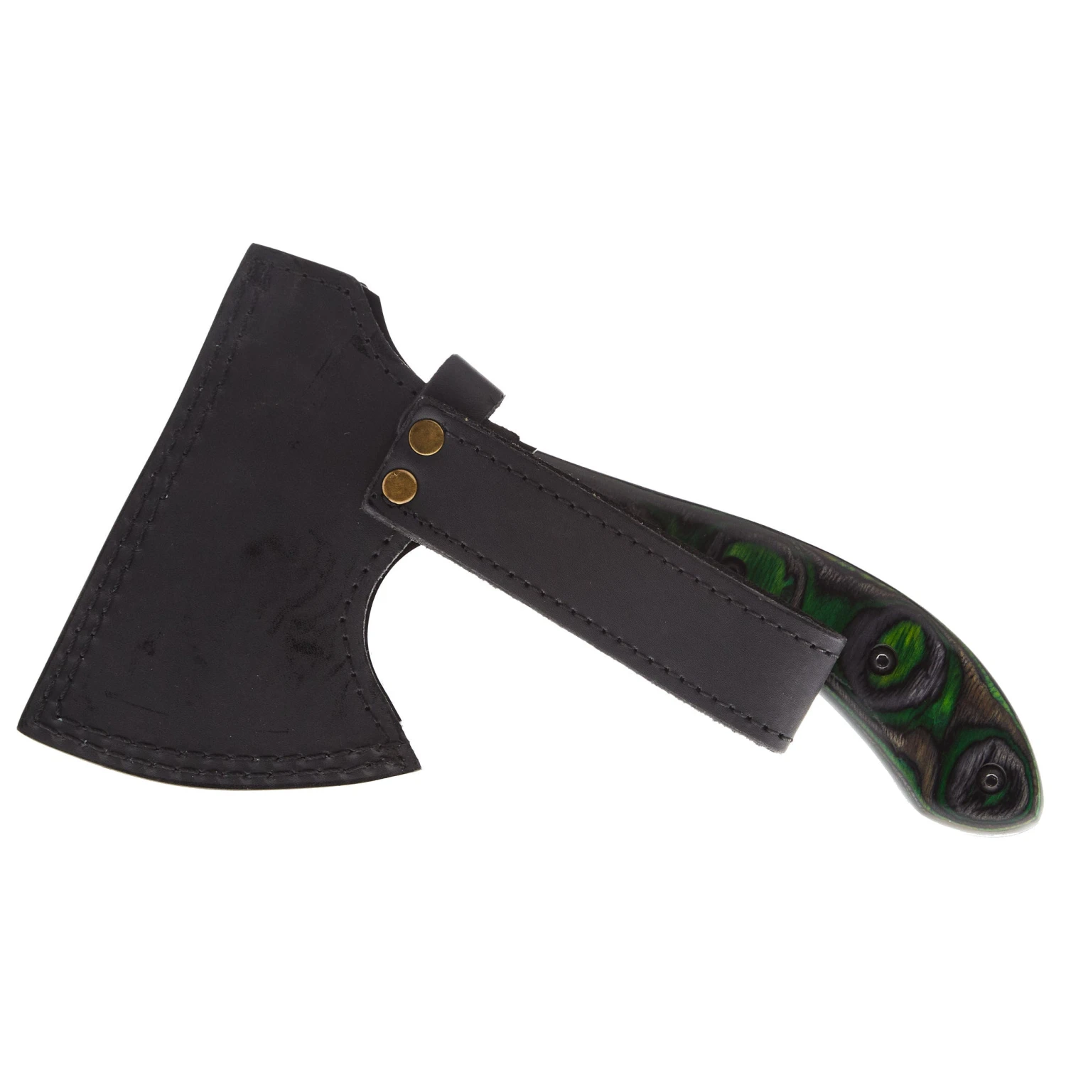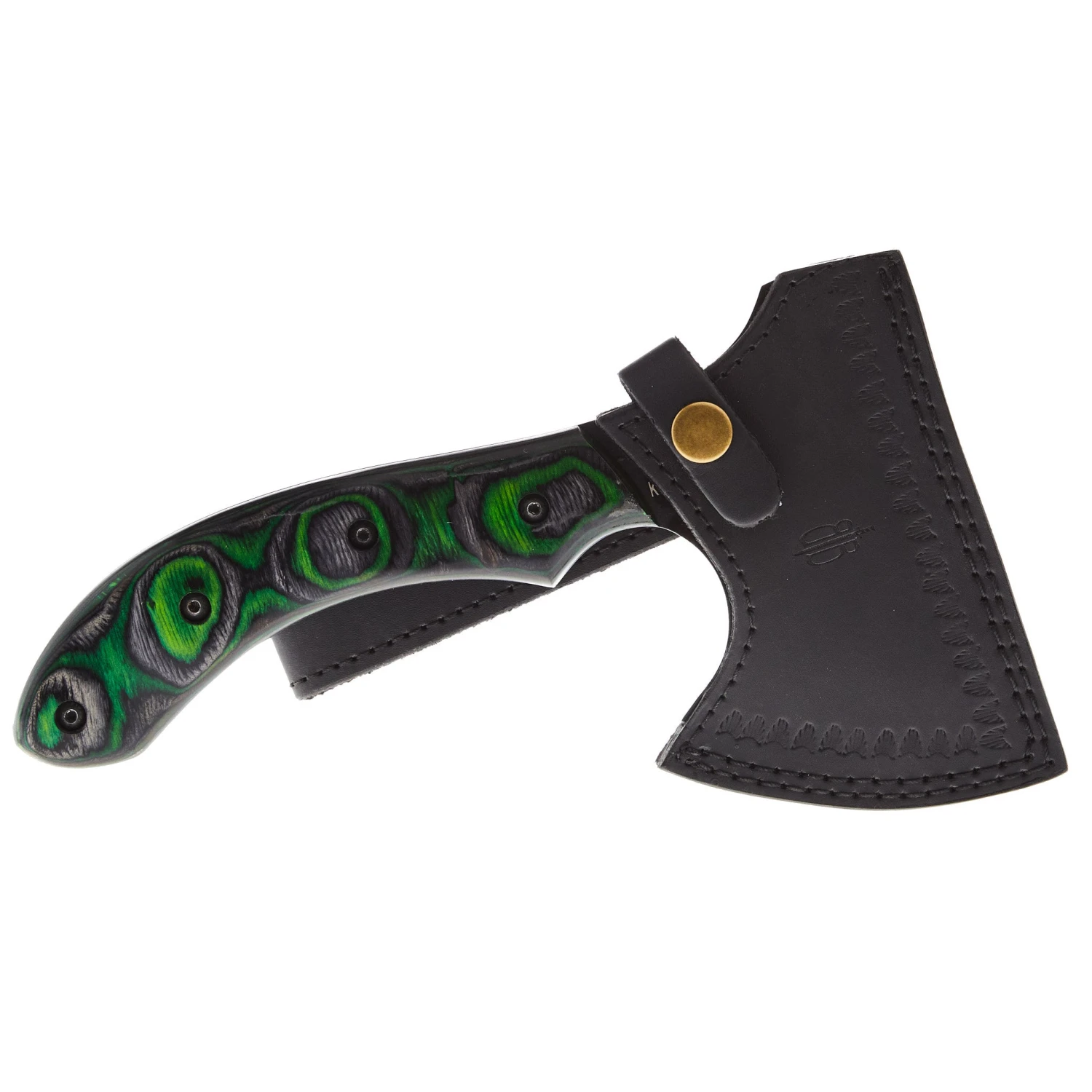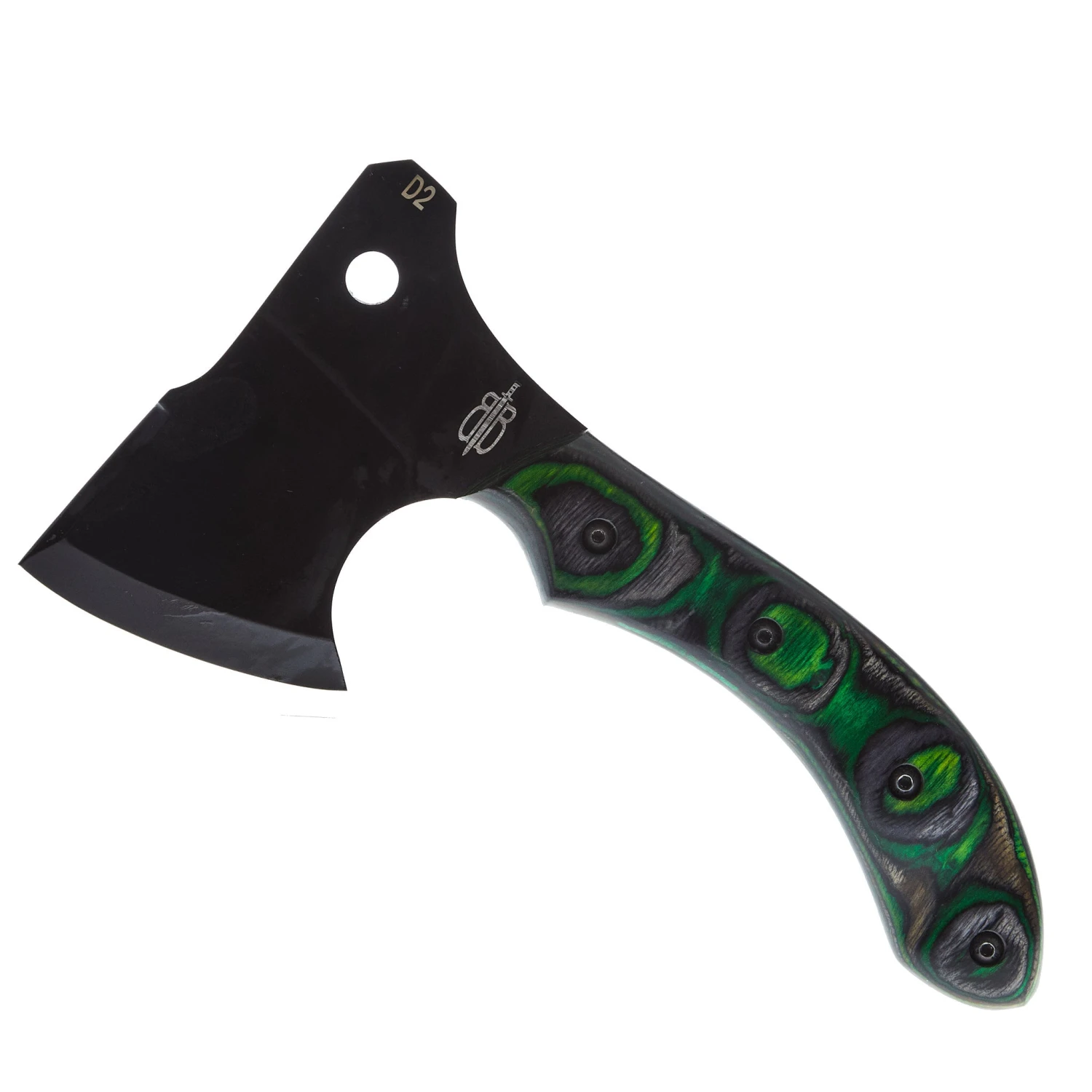 This Tactical Army Hatchet from BnB features a full tang design for high performance strength with a black coated D2 Steel. It has a Maple Burl wood handle offering multiple grip options for hacking, scraping, or cutting. The high performance handle allows you to choke up for detailed control work, providing confidence in hand when swinging the tool. The axe head is equipped with front edge, a top grind, and a tactical hammer. The Tactical Army Hatchet is outfitted with a premium leather sheath that can be carried on the belt to take your tactical game to the next level.
