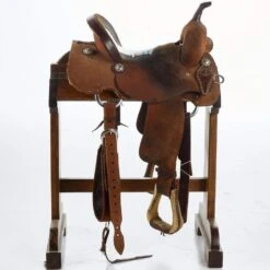 This little rope saddle was designed to fit a pony and a child. It has very small skirts, basket stamping, and sunburst conchos. Be sure to check out out line of pony sized saddle pads too when you buy this saddle!