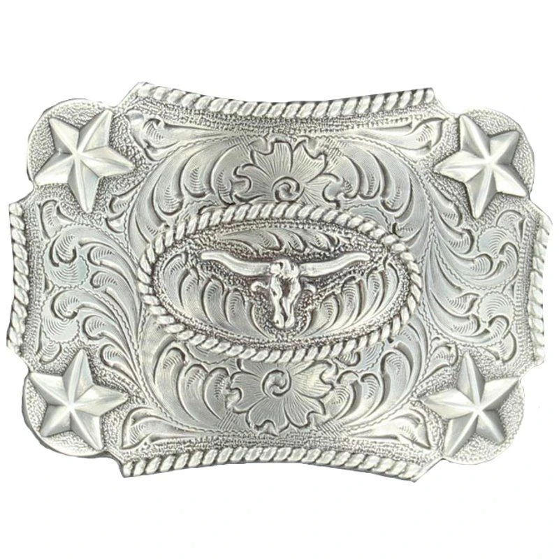 This belt buckle by M&F Western Products is made to make you look sharp! This is a very nice belt buckle that fits most size belts and has your traditional belt loop fastener that is easy to slide on and off. This buckle is made to shine up your outfit! Put this on your favorite leather belt and you will be ready to make your best impression. This M&F buckle is made with silver and is with detailed engraving that makes this buckle unique.