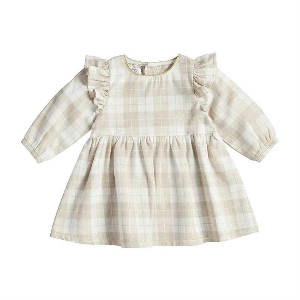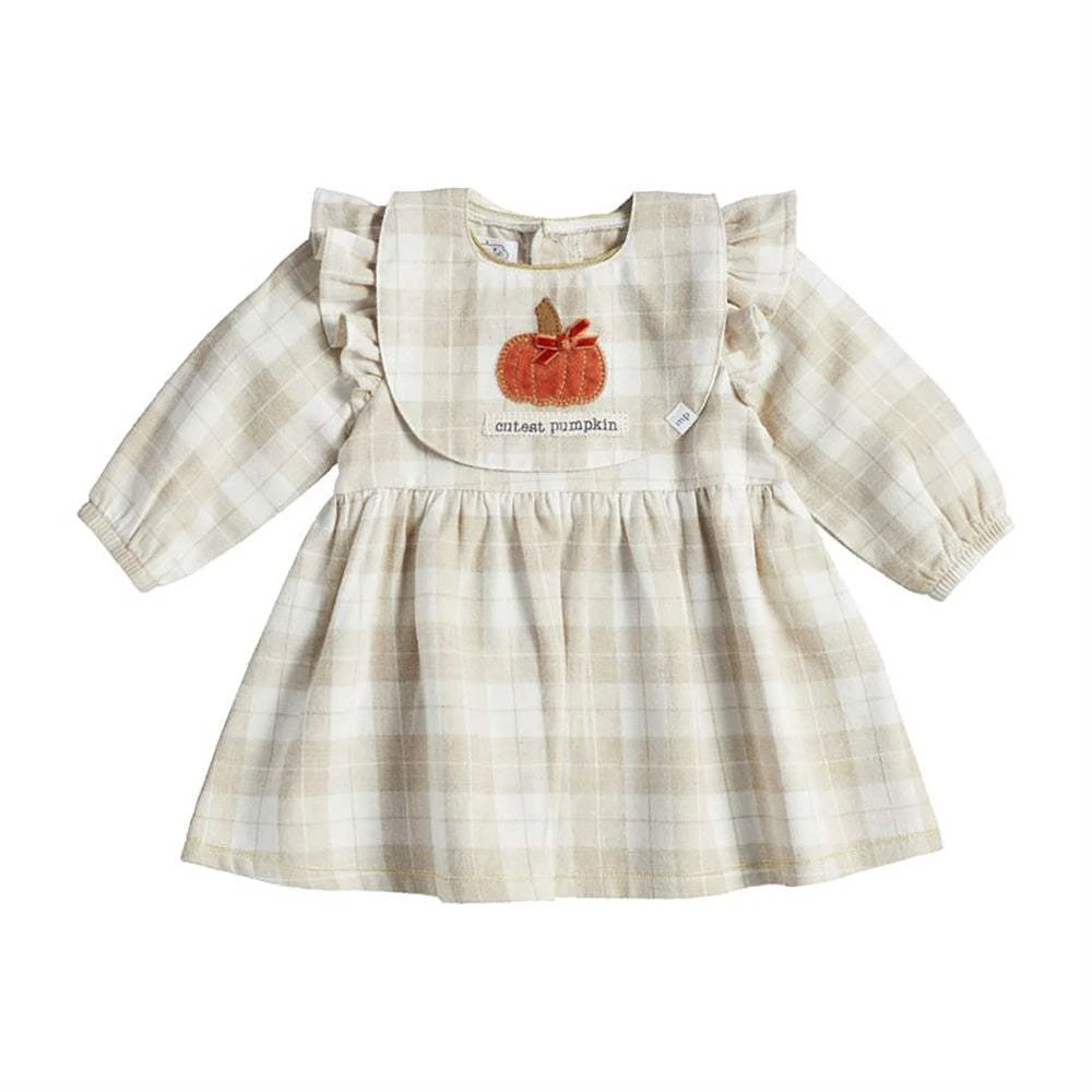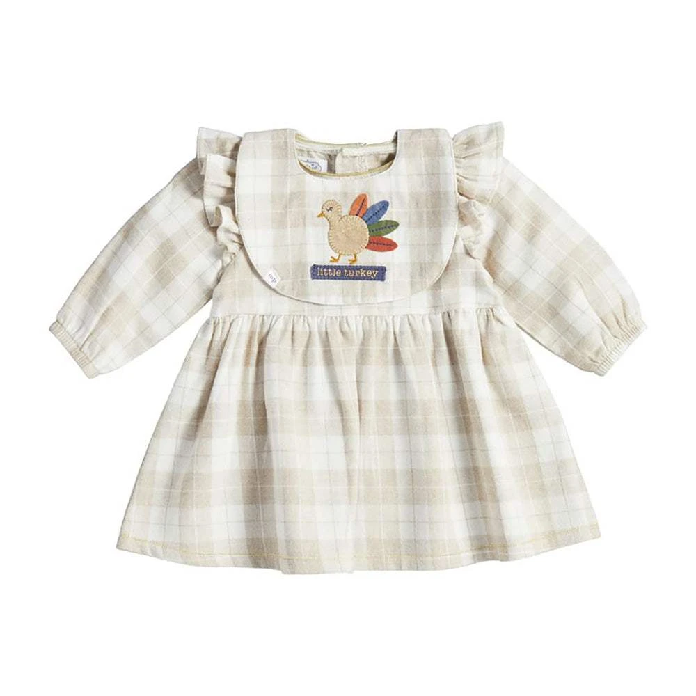 2-piece set. Flannel ruffle dress comes with reversible appliqued bib.