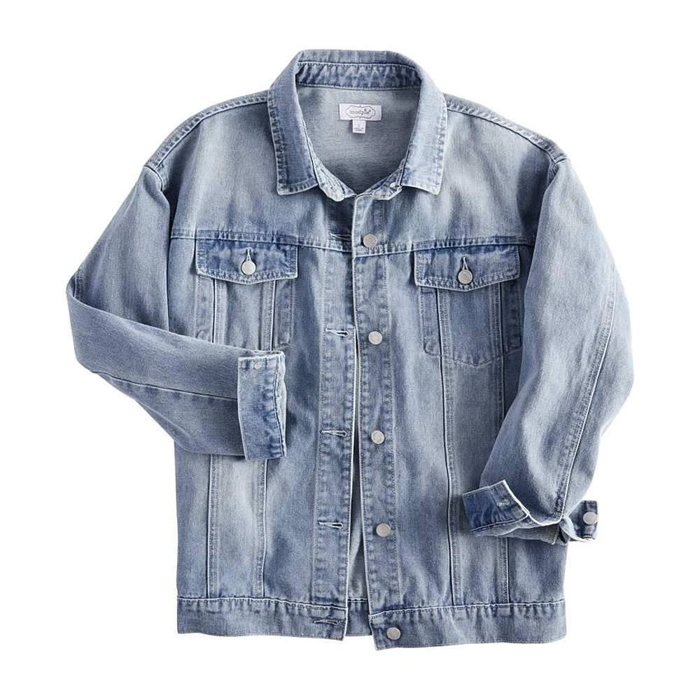 Lightweight cotton denim jacket features oversized boyfriend fit, chest pockets and button closure.
