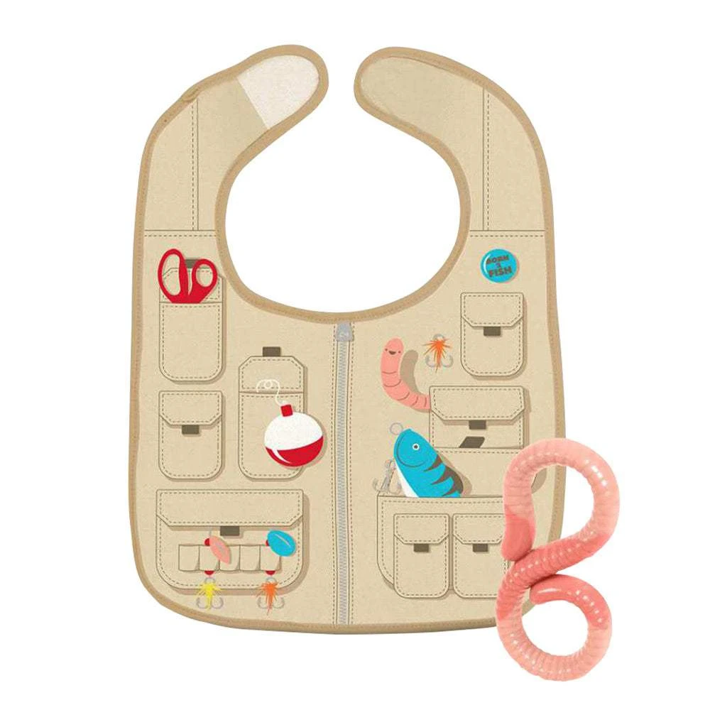 Be prepared to tackle outdoor fashion with Fred’s DRESSED TO SPILL coordinating fishing vest bib and worm teether. You are sure to get a reel big laugh when Junior sports this quirky set. Two layers of 100% cotton fabric sandwich a waterproof layer of TPU to keep spills on the bib, and not on baby. The teether is made of 100% pure, BPA-free and phthalate-free silicone.