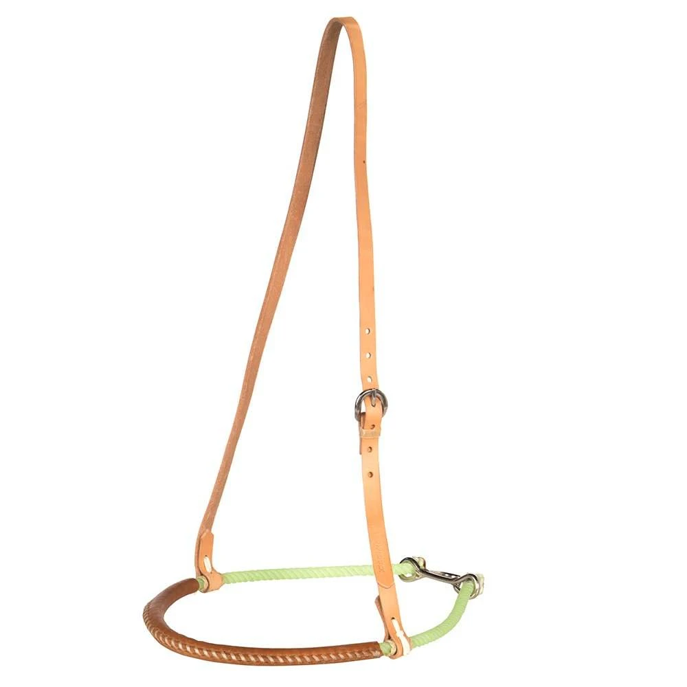 Top Hand Rope single rope, brown harness noseband. Handmade with rawhide lace and braided rawhide keeper. Plus, stainless steel/brass hardware. Available in three colors; Red, Blue, Green. TH-NB1