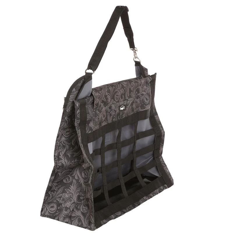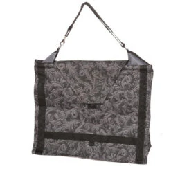 Easy to fill with extra large top. Heavy denier nylon with dividers and “quick grip” closures at top so hay can’t be drug out of the top. 10” wide mesh bottom. Adjustable hand straps with snap. 24” x 20