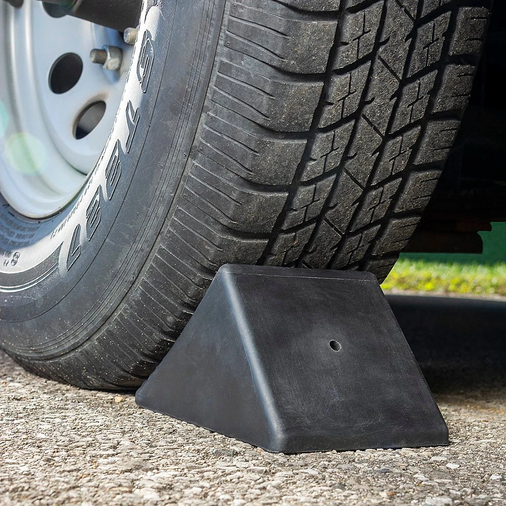 Durable, rubber wheel chock prevents trailer from rolling when unhooked from truck. Non-slip surface for great hold in all types of weather.
