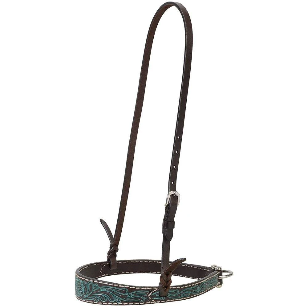 Constructed from dark oiled leather with a turquoise stain that highlights the beautiful floral tooling, this 1in tapered noseband offers great quality at a great price. Non-rust stainless steel hardware. 45-0223