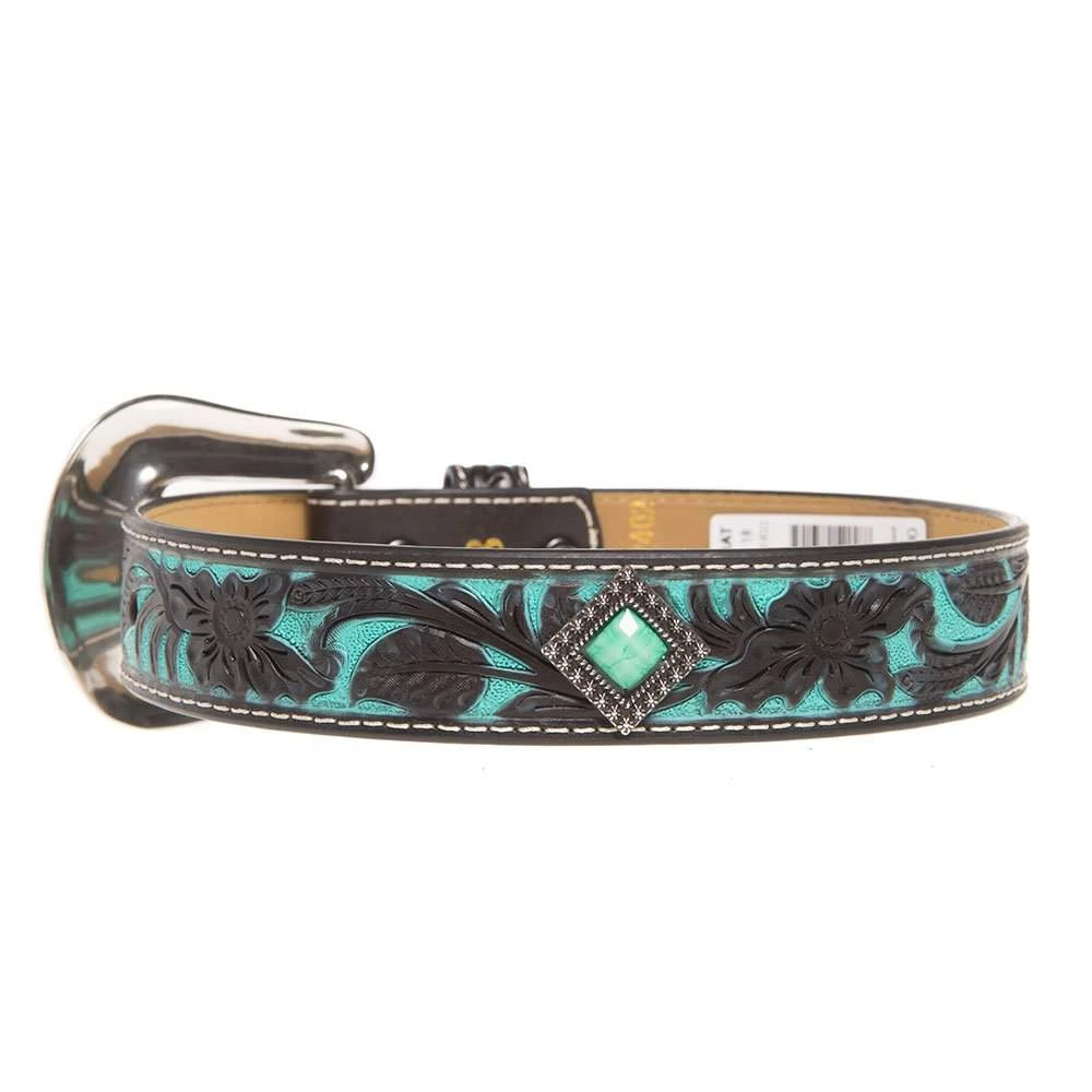 Your kiddo will look sharp in this floral tooled belt with turquoise inlay!